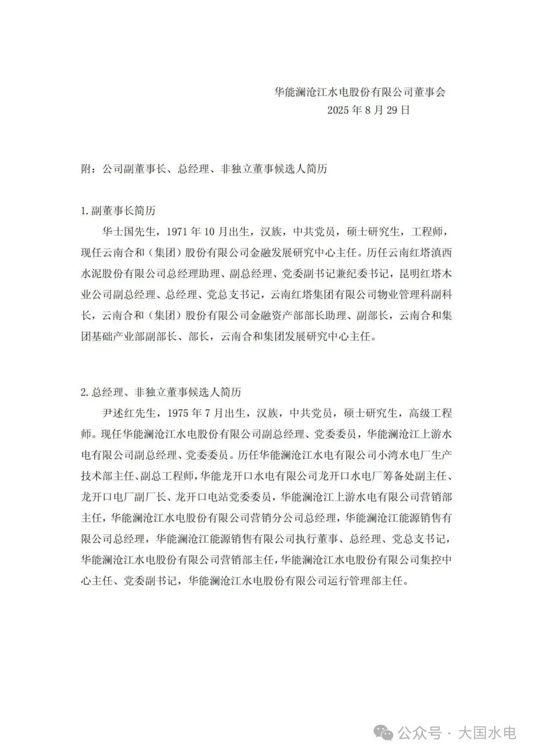 8月28日,华能澜沧江水电股份有限公司(以下简称“华能水电”)公告称,华能水电于8月28日召开第四届董事会第十次会议,审议通过了《关于选举公司副董事长的议案》《关于聘任公司高级管理人员的议案》《关于选举公司非独立董事候选人的议案》。