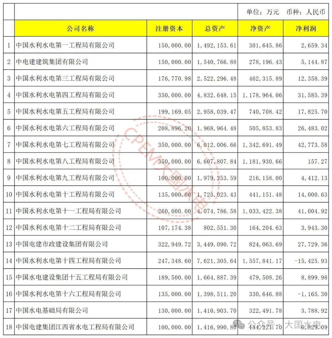 中国电建旗下32家建筑施工类子公司,CPEM大国水电整理了18家水电与抽水蓄能相关的施工类公司。从净利润来看水电七局、水电十一局排前列,水电十四局、水电十六局净利润为负。