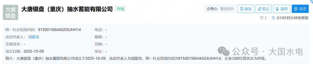 10月9日,CPEM大国水电获悉中国大唐于重庆成立一家抽水蓄能公司:大唐银盘(重庆)抽水蓄能有限公司,法人周能奇。