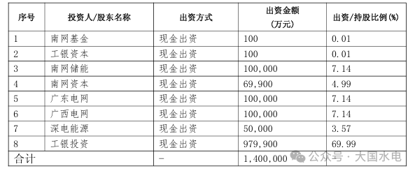 投资人投资情况:南网基金作为该基金的管理人及执行事务合伙人,认缴100万元;工银资本作为该基金的执行事务合伙人,认缴100万元;南网储能认缴10.00亿元,认购份额占比7.14%;广东电网认缴10.00亿元,认购份额占比7.14%;广西电网认缴10.00亿元,认购份额占比7.14%;南网资本认缴6.99亿元,认购份额占比4.99%;深电能源认缴5.00亿元,认购份额占比3.57%;工银投资认缴97.99 亿元,认购份额占比69.99%。