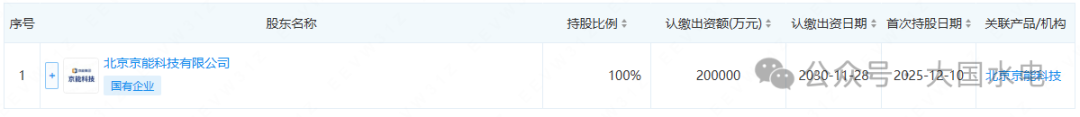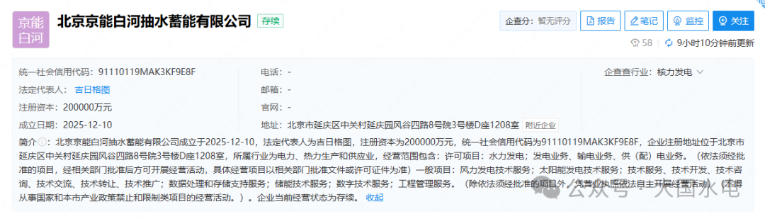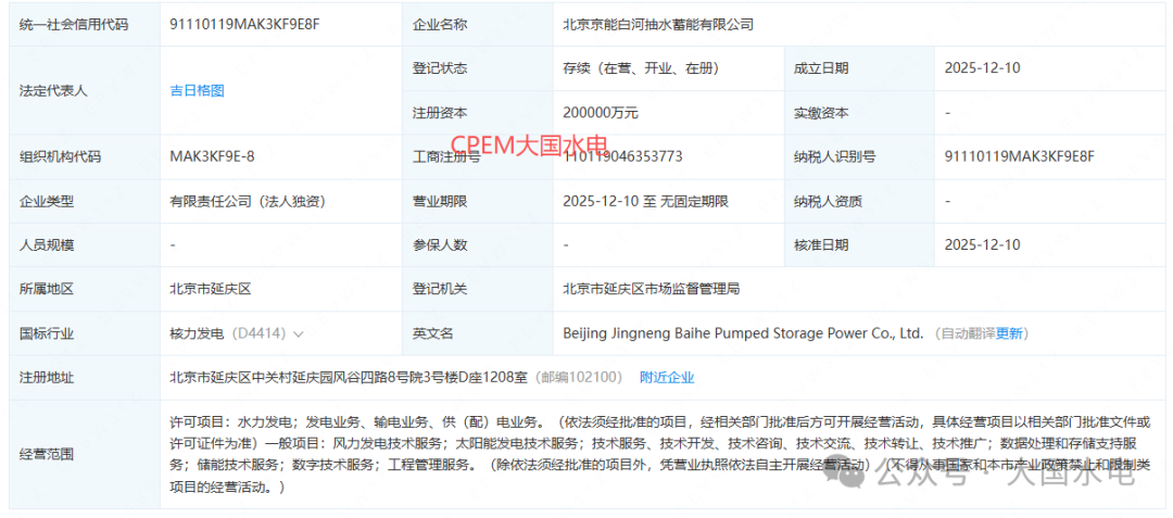 【CPEM大国水电】获悉,2025年12月10日,京能集团新成立一家全资子公司北京京能白河抽水蓄能有限公司,注册资本20亿元,注册地位于北京市延庆区,由京能集团100%控股。