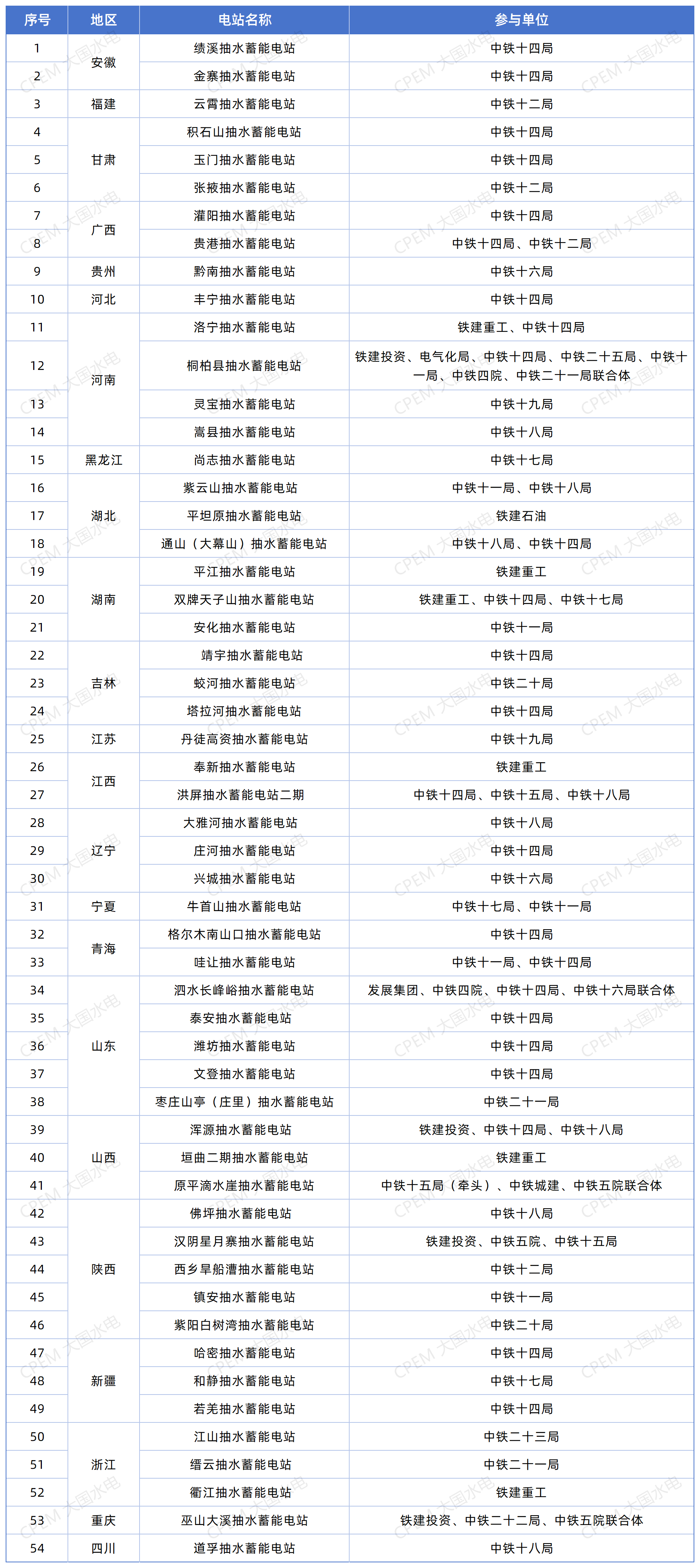 2023年后,中国铁建在抽水蓄能领域进入快速发展期,参与多个国家级重点工程。据CPEM、大国水电不完全统计,中国铁建参与的抽水蓄能项目遍布了全国20多个省份,总计约54个,如下: